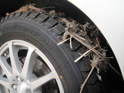 「車のタイヤに鳥が巣を作ろうとしてる。」
