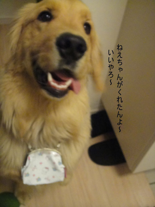 がまぐちのお財布を首にぶらさげ自慢気なランくん。