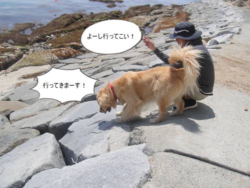 ランくん、いつもの海ではないので、ビビりながらの入水です。