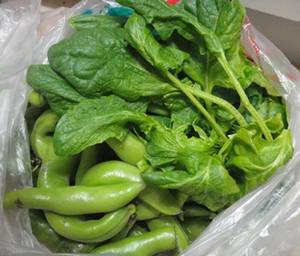 今晩のおかずは、もらったキャベツ・玉ねぎ・そらまめ・ほうれんそう、、と