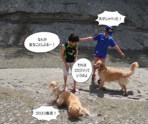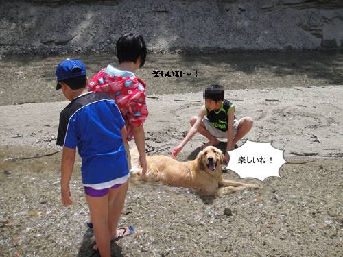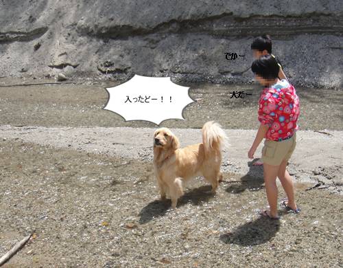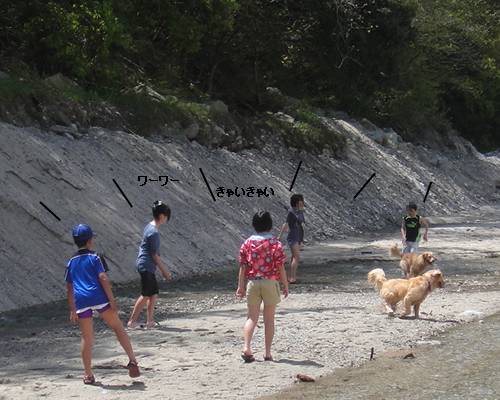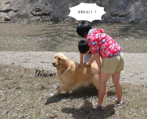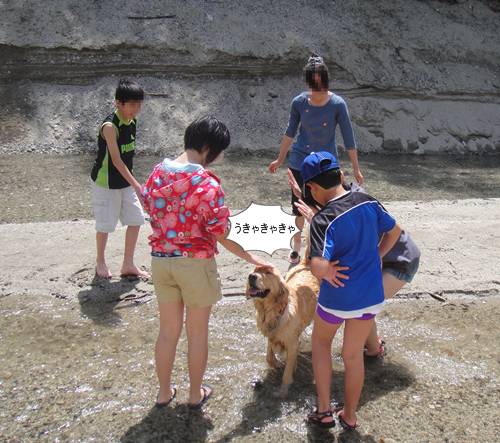 水にはいれて、「どや顔」のランくんを見る子供たち。