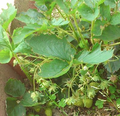実家の庭に、昨年植えたイチゴ。