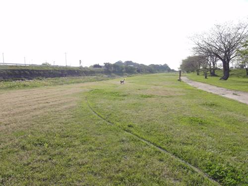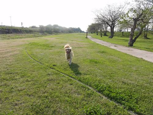 週末は、散歩代わりに近所の川辺の公園で、運動するランくん。