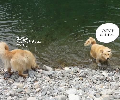 川に飛び込んだリキとは対照的に、川に飛び込む勇気が出ないランくん・・。