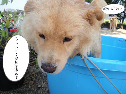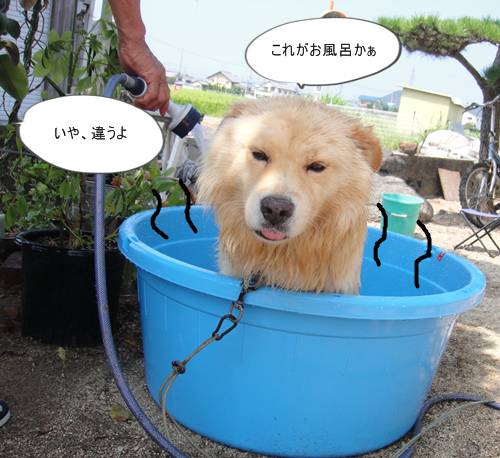 ●ヶ月ぶりのシャンプーをしたあと、タライに入れられたリキ。