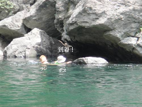 ランくんとボスが、向こう岸まで泳ぎつきました。