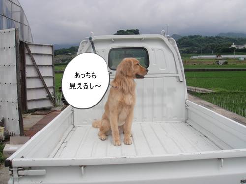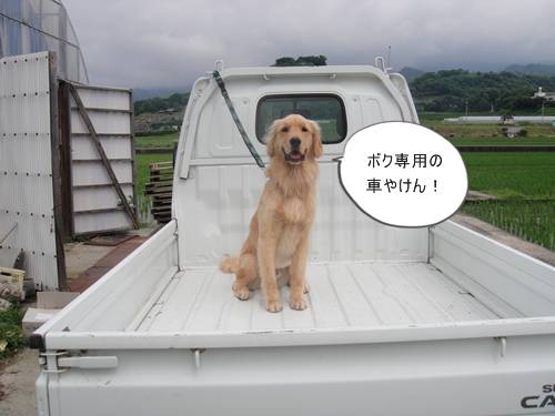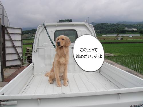 海で泳いだあと、軽トラの上で、シャンプーしたランくん。