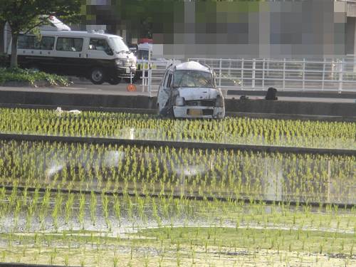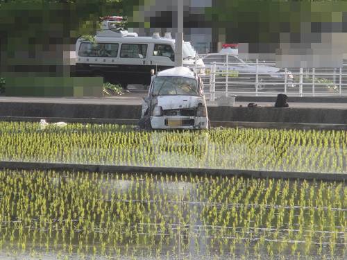 なんと、車が田んぼに突っ込んでいるのを発見。